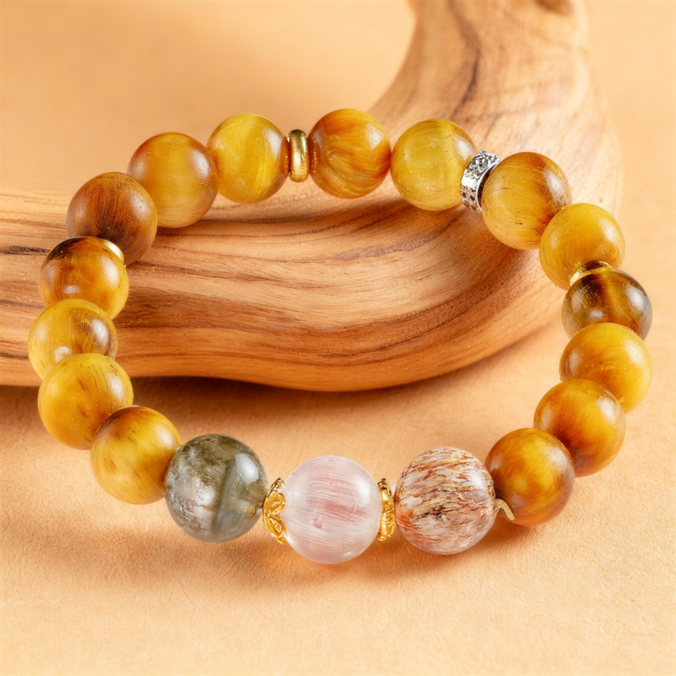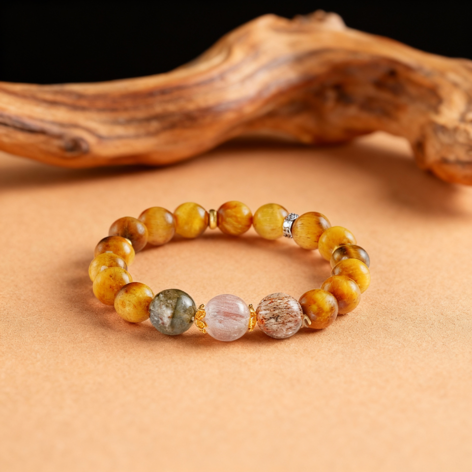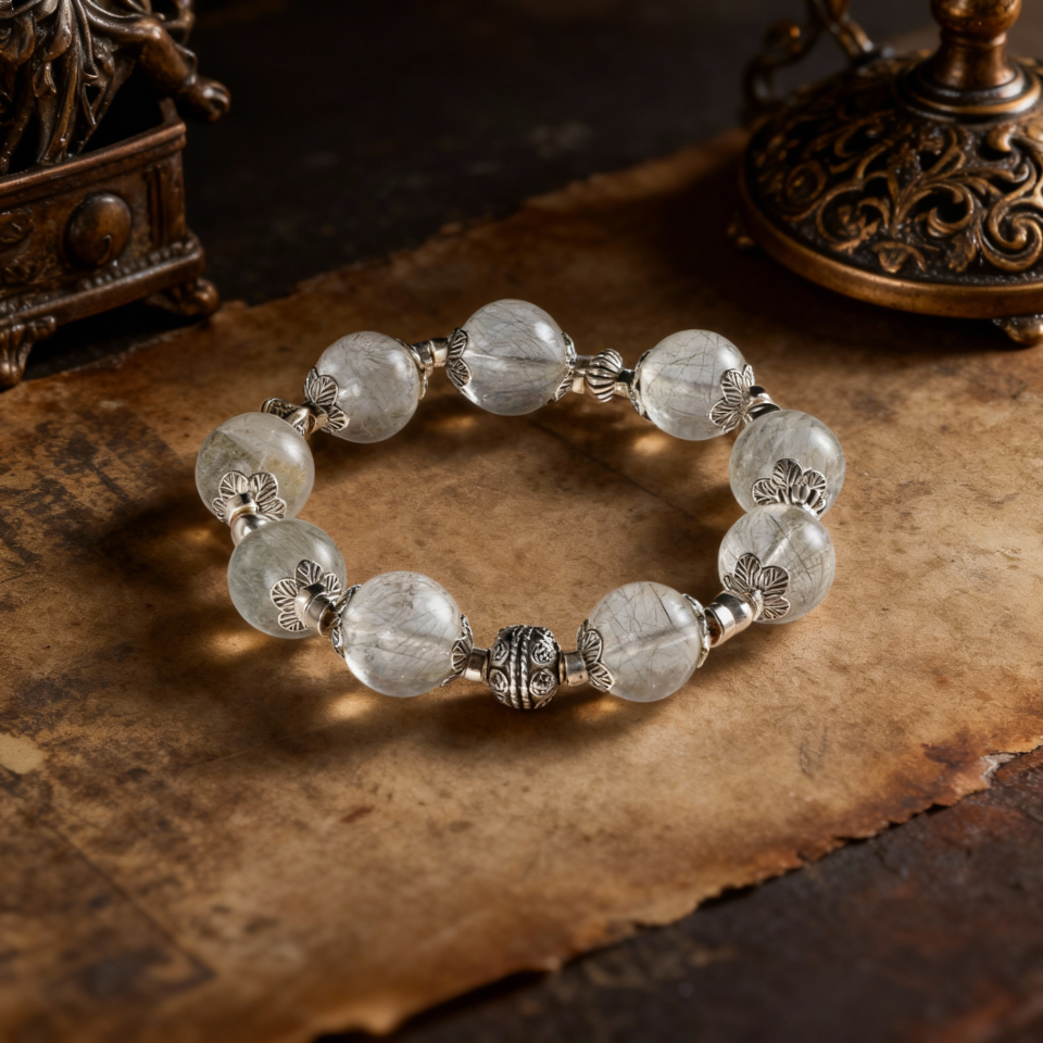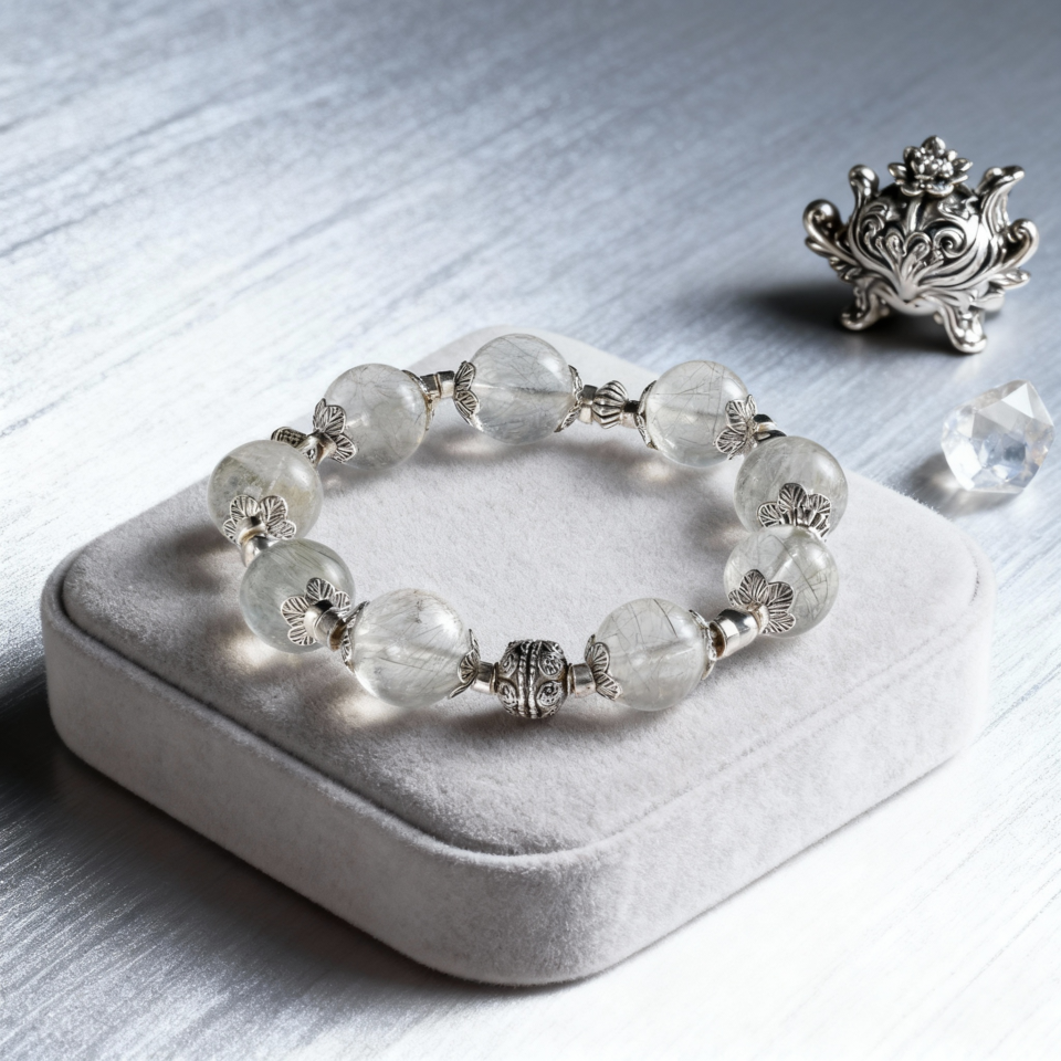 This string is a metaphysical talisman of “Purifying Space & Awakening Wisdom” — the main bead is white rutilated quartz, with white rutiles swirling like silver mist within the crystal. Revered as a spiritual gemstone for “cleansing energy fields and activating inner wisdom” in metaphysical traditions, it emits a magnetic resonance of “removing obstacles and organizing thoughts.” It aids the wearer in purifying negative energies around them, untangling muddled thinking, while awakening innate intuition and wisdom. The accompanying silver accessories enhance its serene properties, strengthening the pure conduction of energy.